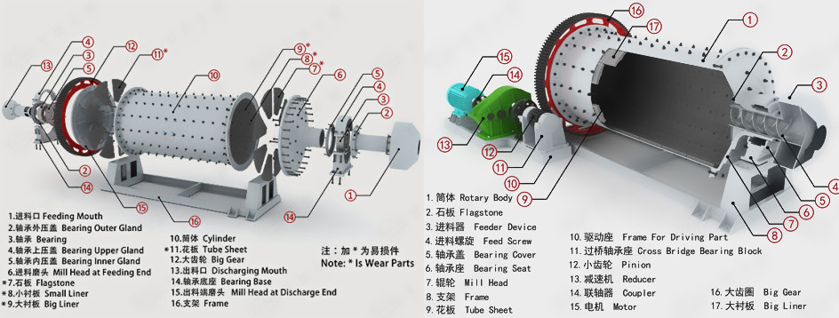 昆重礦機生產(chǎn)的濕式格子型球磨機主要是由進料器、出料器、端蓋、法蘭盤、筒體、中心襯板(格子板)、大齒輪、傳動總成(減速機、小齒輪、聯(lián)軸器、電機)等部件組成。格子型球磨機的格子板,一般使用高錳鋼耐磨料制作,耐磨性好,使用壽命較高。